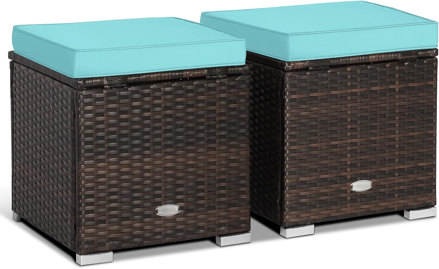 Description: Happygrill set of 2 rattan ottomans will bring you much comfort for outdoor relaxation. Equipped with zippered comfy cushions filled with high-density sponge, the ottomans not only make your feet relaxed, but also provide you with additional seat for outdoor relaxation. You can also remove the cushion and turn the ottoman into a side table for more convenience. And there is ample storage space inside after you opening the top lid. What's more, the 2 ottomans are quite sturdy with the reinforced metal frame. Its PE rattan surface adds more elegance and ensures longer service life. All in all, the 2 patio ottomans are perfect for multiple occasions such as poolside, balcony and so on. Note: Please avoid rain exposure for long-lasting service life Note: Color difference may occur due to different lights or monitors Features: Can be used as a storage box, a footstool, a side table or an additional seat Ample storage space inside offers more convenience Soft seat cushions bring you optimal comfort Smooth zippers make the cushion cover easy to remove and wash Stable metal frame ensures 350 lbs heavy weight Hand-woven PE rattan is elegant and durable Horn button and elastic rope keep the cushion in place Anti-slip footpads protect the ground from scratches Easy to assemble with the clear instruction Specifications: Color of PE Rattan: Mix Brown Color of Cushion: Beige/Off White/Red/Turquoise/Gray/Navy Material: Metal, PE Rattan, Sponge, Polyester Ottoman: 16" x 16" x 15.5"(L x W x H) Cushion: 16" x 16" x 2.5"(L x W x Thickness) Inner Space: 14" x 14" x 13"(L x W x H) Weight Capacity: 350 lbs Net Weight of Each Ottoman: 9 lbs Package Includes: 2 x Ottomans 2 x Cushions 1 x Instruction