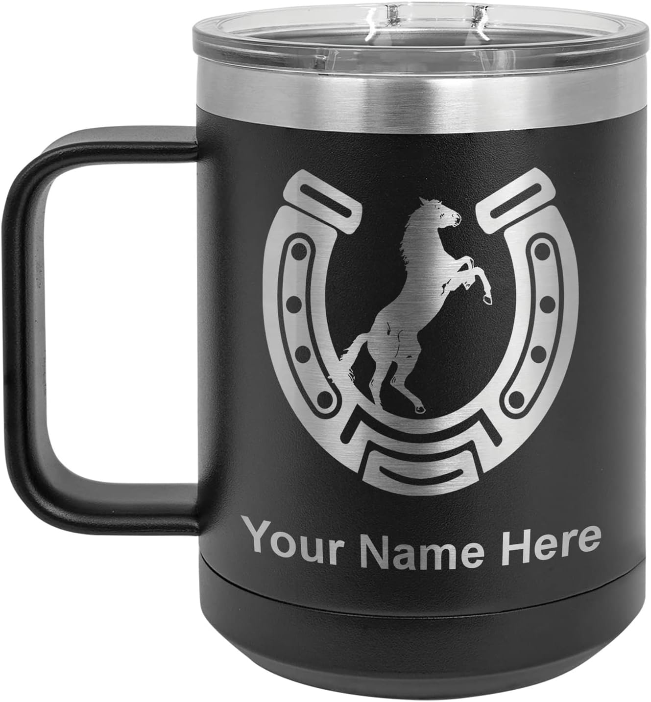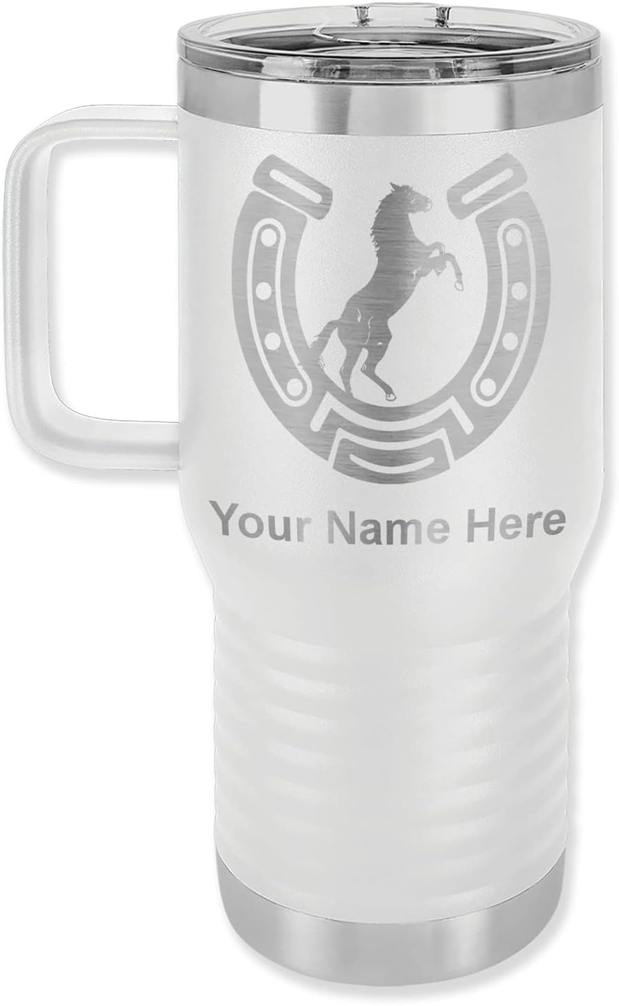 LaserGram 40 ounce Travel Mug with Handle that is laser engraved with the image that you see in the photo. Your own personalized text will be laser engraved below the image. Features double-walled stainless steel vacuum insulation with a clear lid. Click the "Customize Now" button to begin customizing your mug.